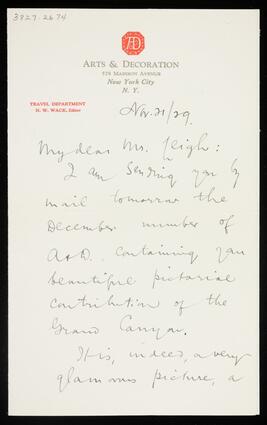 Title: Letter from H.W. Wack to Leigh regarding the publication of Arts and Decoration containing the Grand Canyon photograph