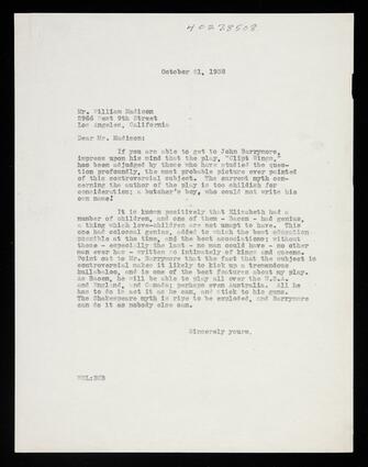 Title: Letter from Leigh to Mr. William Madison in Los Angles hoping to get a copy of Leigh's play, "Clipt Wings" to John Barrymore, hoping that his acting and its controversial subject will make it a famous play