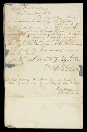 Title: Authorization by Hugh McPherson for William Ryan to marry Nancy Fields with notation from Judge I. M. Hildebrand