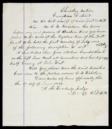 Title: Order by A. L. Woodall to turn over to C. N. Nicholson the specified cow
