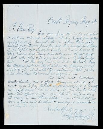 Title: Letter to from A. P. Bright to R. Drew, Esq. concerning purchase of a lot and lumber