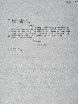 Title: Letter from John Ross to W. Charles Goodey, President National Committee, concerning Worcester’s' printing establishment