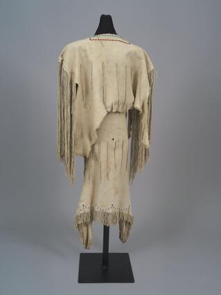 Title: Girl's buckskin dress with blue, red, and white lazy stitched beading and fringe