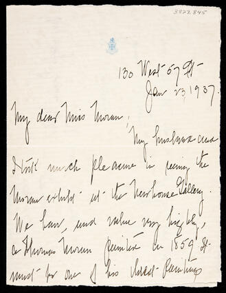 Title: 3 page handwritten letter from Mrs. Hugh G. Miller of New York to Ruth Moran concerning the Thomas Moran exhibition at Newhouse Gallery