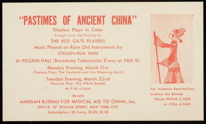 Title: Card-sized advertisement for "Pastimes of Ancient China" shadow puppet performance to benefit the American (sic) Bureau for Medical Aid to China, Inc., New York City