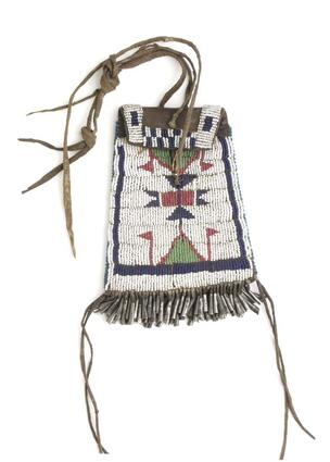 Title: Beaded strike-a-light bag with leather fringe on the bottom of the bag and on the flap as a tie