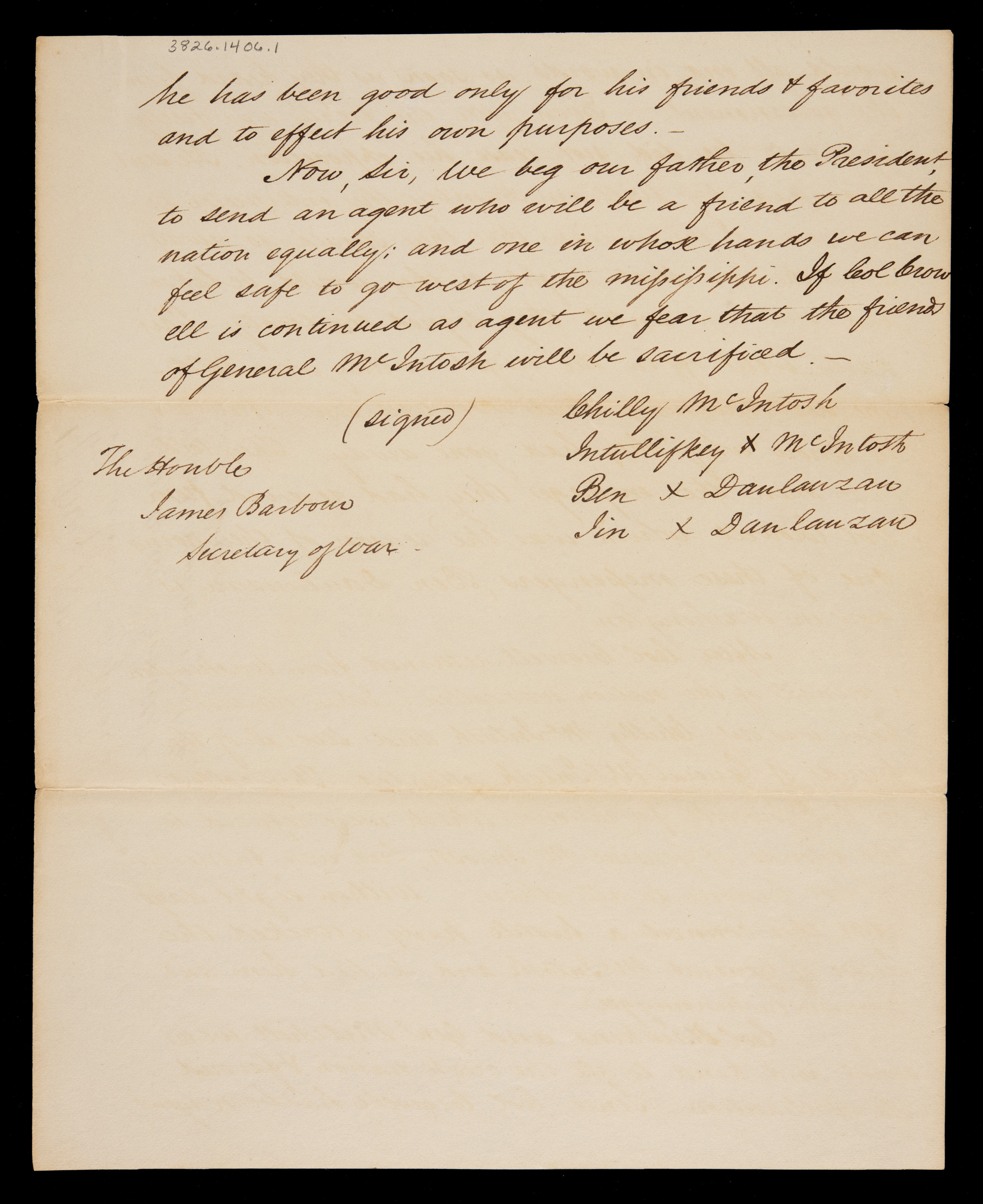 UMO ID: 258103812Parent Museum Object: Letter to James Barbour from Chilly McIntosh, Intullifkey McIntosh, Ben Danlausau, and [Jin] DanlausauDisplay Order: 0Primary: No