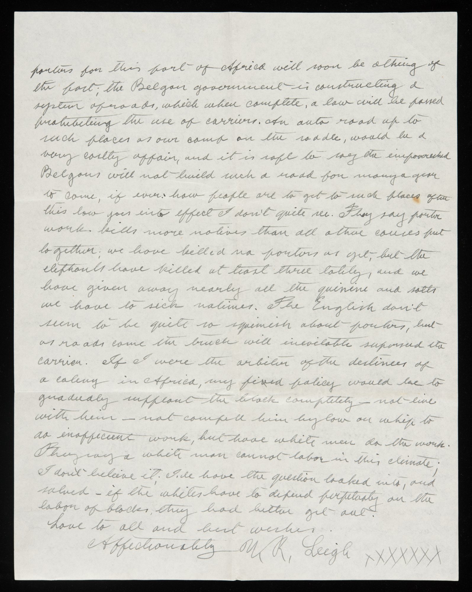 UMO ID: 114005871Parent Museum Object: Letter with envelope from Leigh in Uganda to Ethel describing their travel to a new camp, an attack of man by an elephant, the terrain of lake country, and asks "what is the purpose of life"Display Order: 8Primary: No