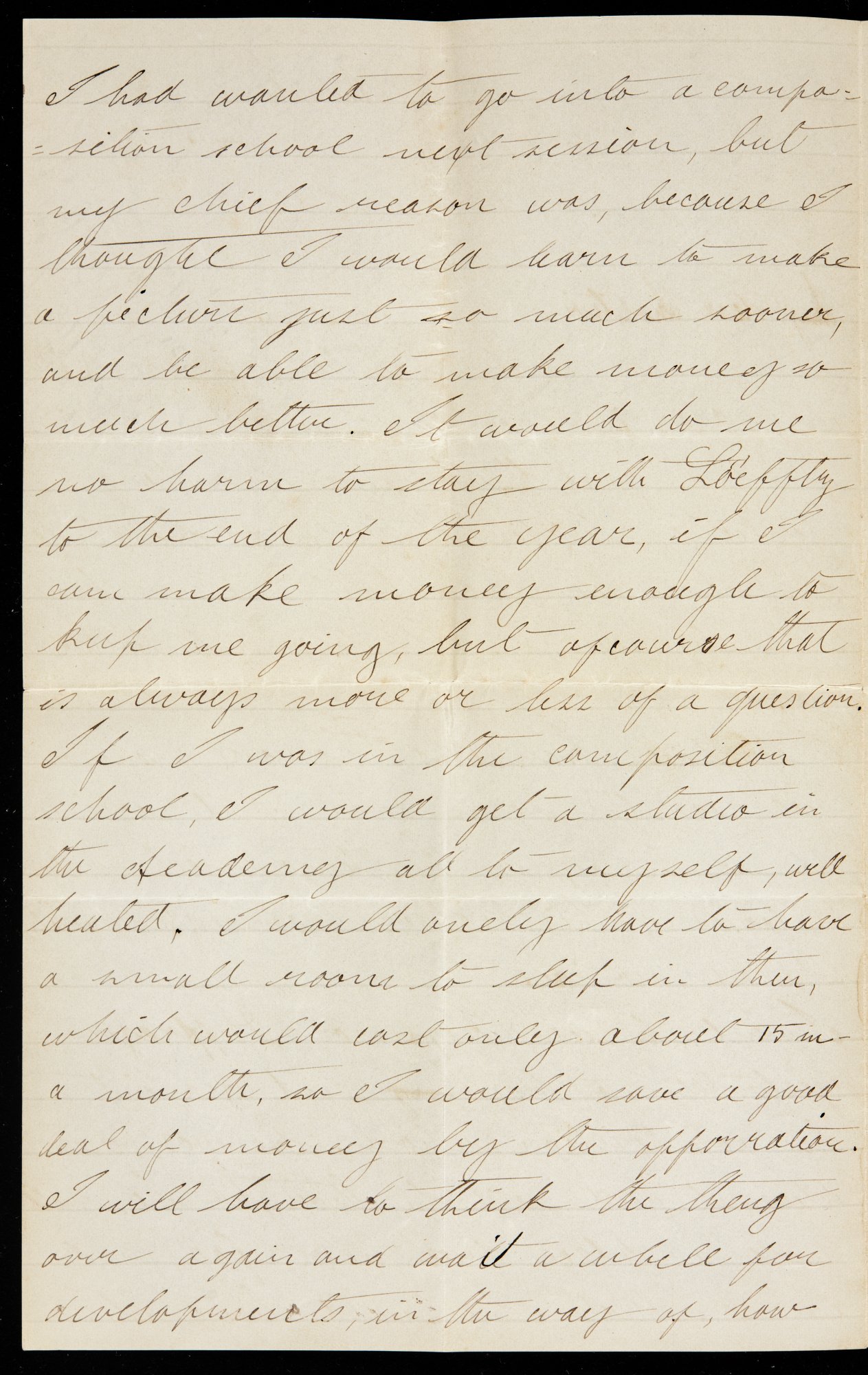 UMO ID: 114104876Parent Museum Object: Letter from Leigh to his mother about his possible opportunity to join Professor Deffreger's Composition School as well as work on his painting of a mother and baby that he would be able to sellDisplay Order: 4Primary: No