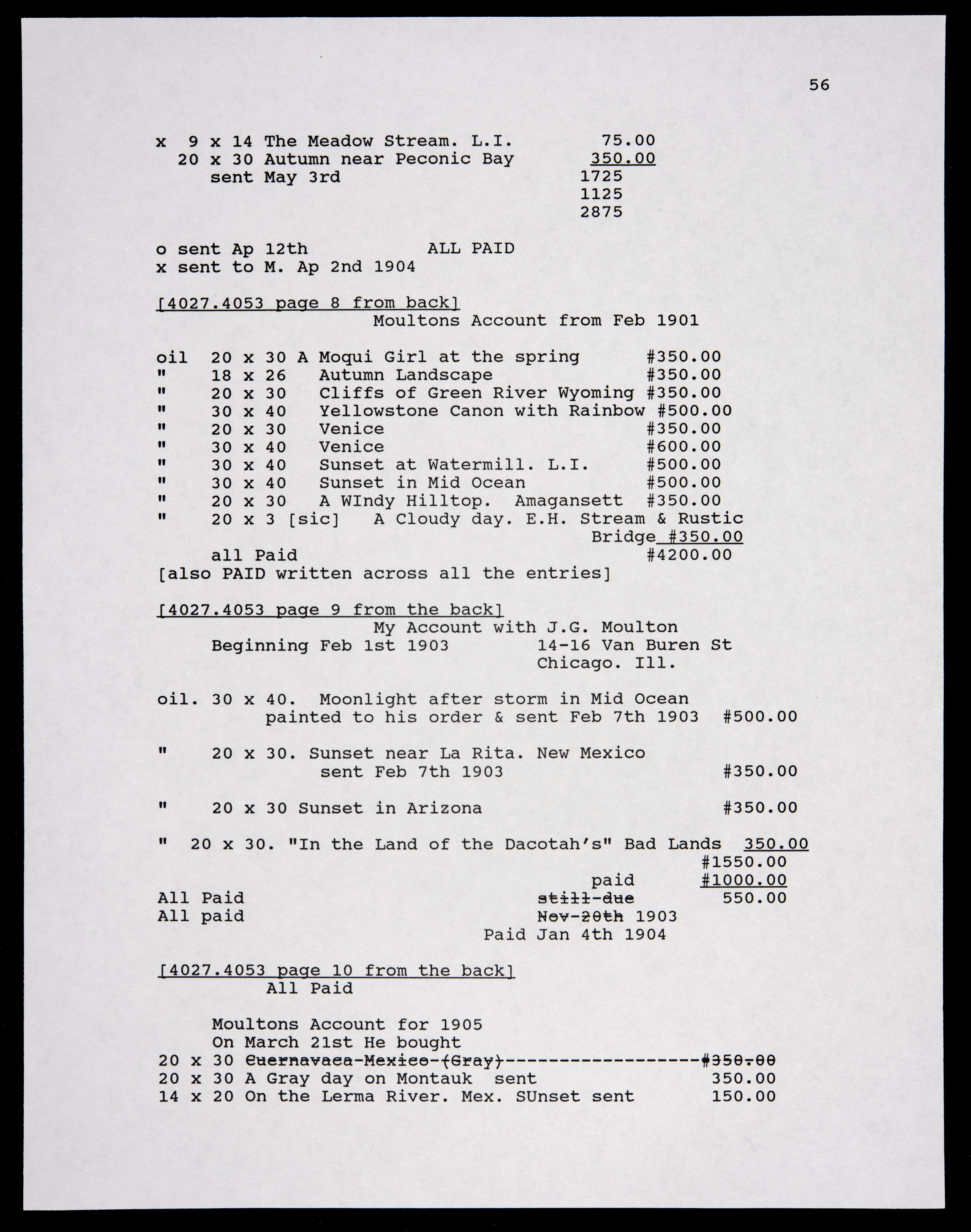 UMO ID: 199188266Parent Museum Object: 61 page typescript of a catalog of Thomas Moran's art materials and artwork with sale prices, patrons, locations and edits by Anne MorandDisplay Order: 0Primary: No