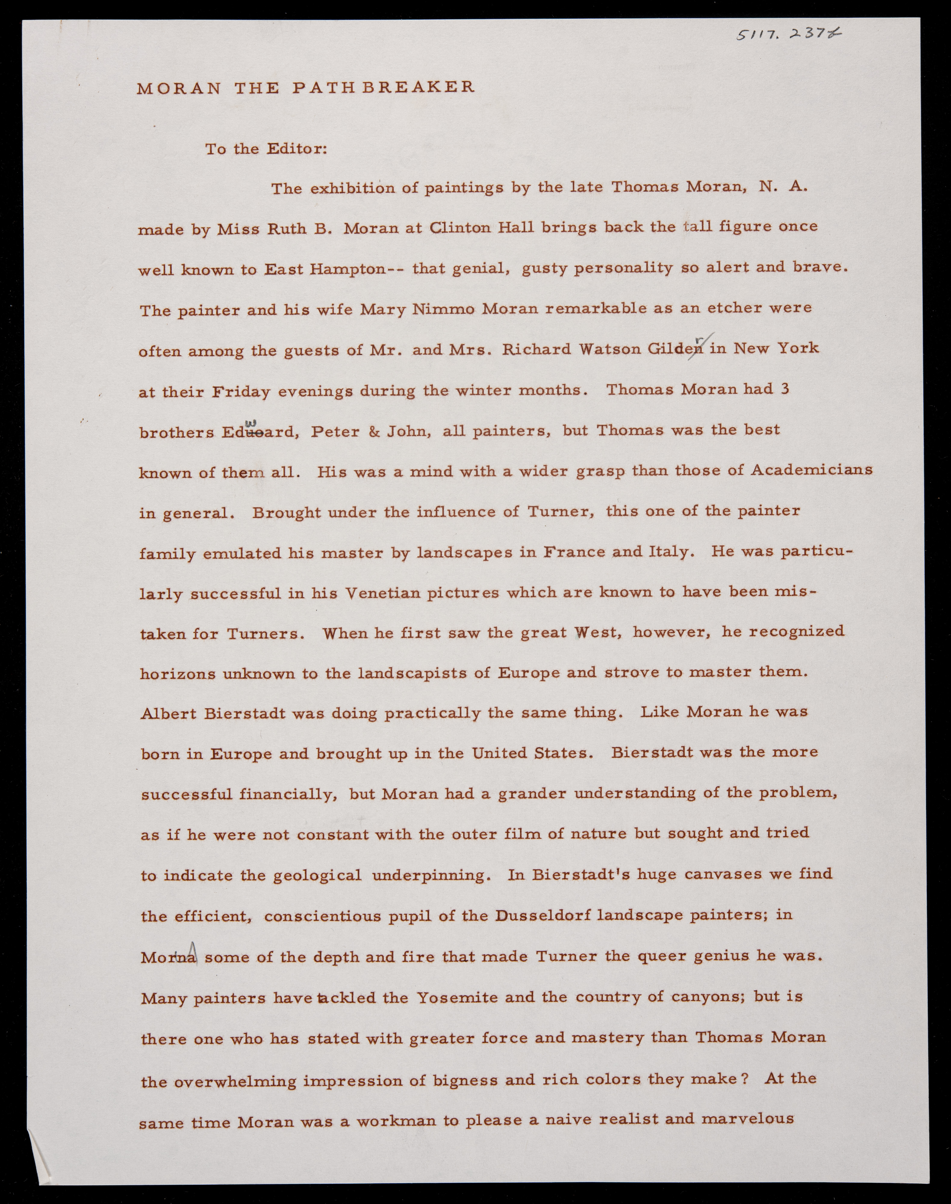 UMO ID: 199358346Parent Museum Object: "Moran the Pathbreaker" written by Charles deKay to the editor in response to Clinton Academy exhibition; 4 page handwritten letter and 1 1/2 page typed transcriptionDisplay Order: 4Primary: No