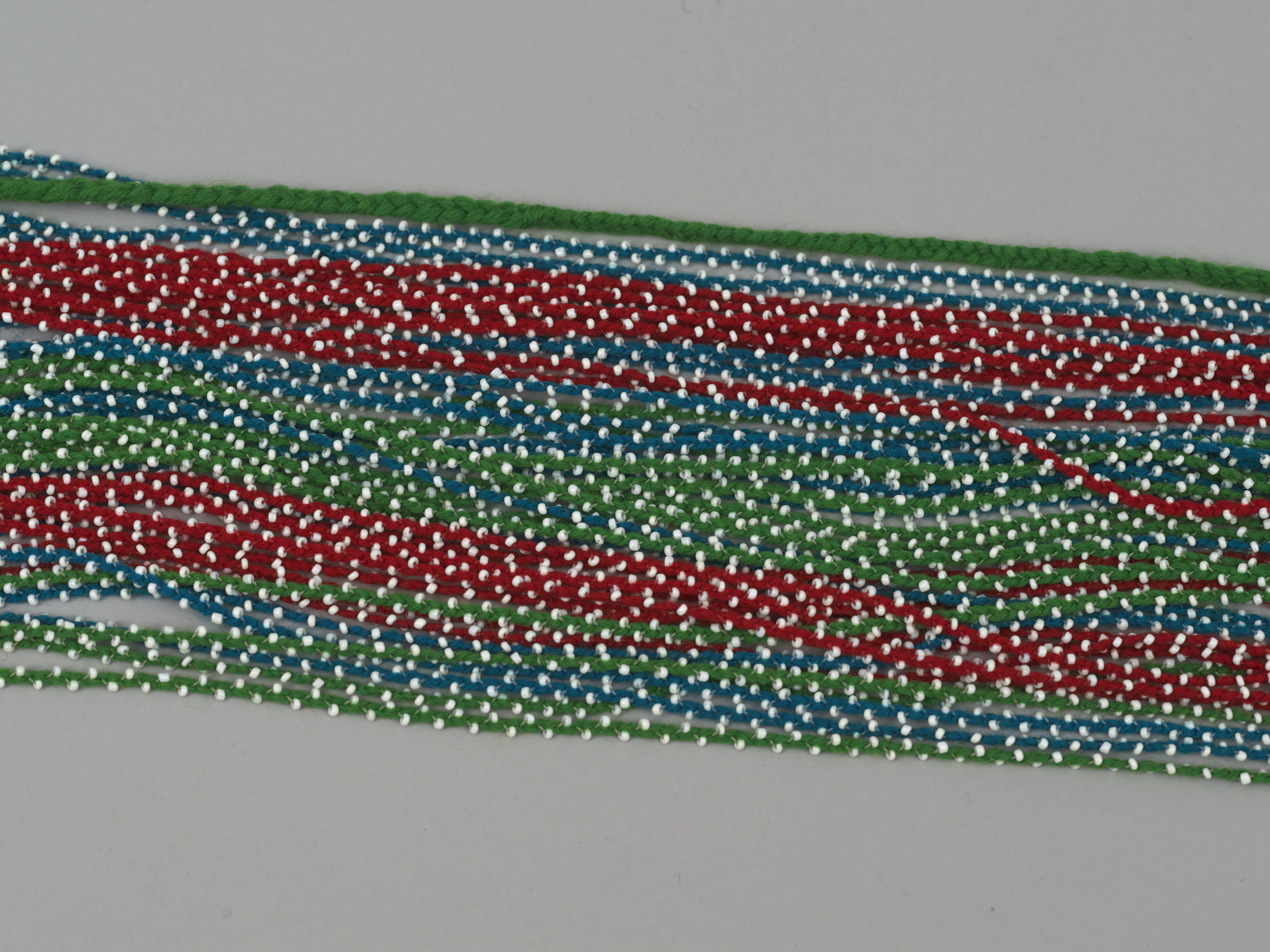 UMO ID: 178974316Parent Museum Object: Finger woven sash with arrow design in blue, green, and red with long fringe and white beadsDisplay Order: 0Primary: No