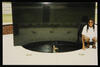 Unidentified woman in a white dress wearing a large black and white feather hat |