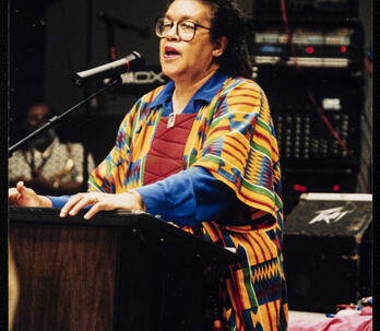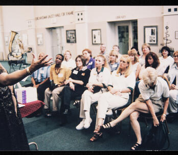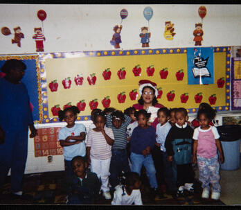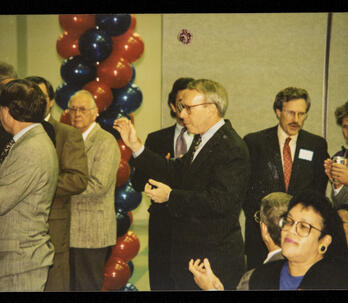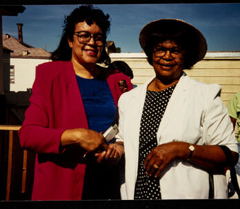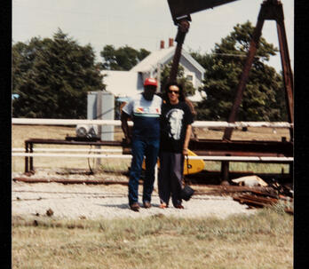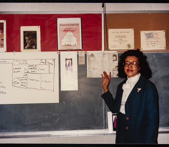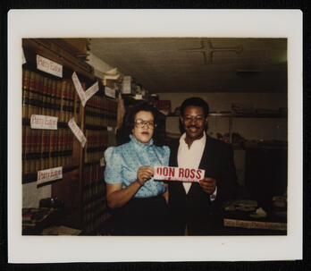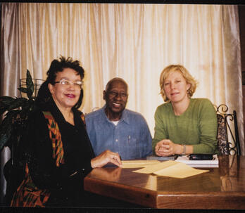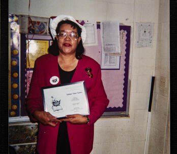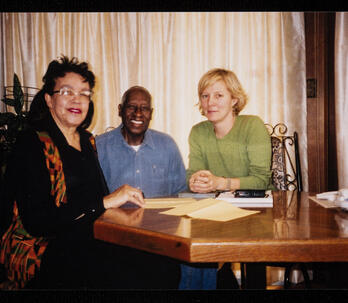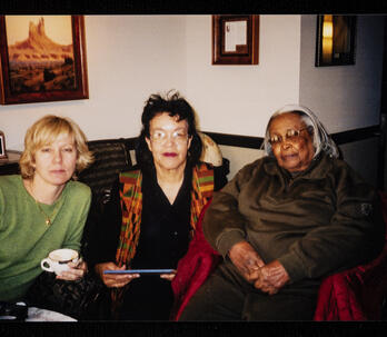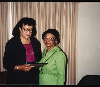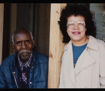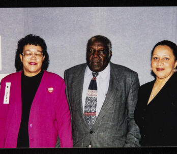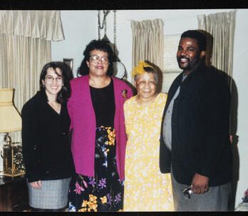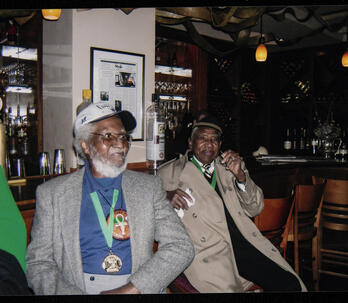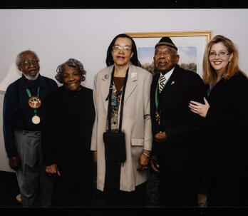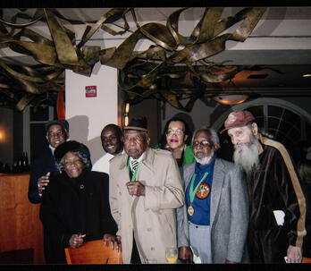 Survivors posing with the waiter; pictured left to right are Raymond Knight, Thelma Thurman Knight, an unidentified waiter, Otis Granville Clark, Eddie Faye Gates, Wess Young, Sr., and Robert Holloway at a fancy restraunt in Washington, District of Columb