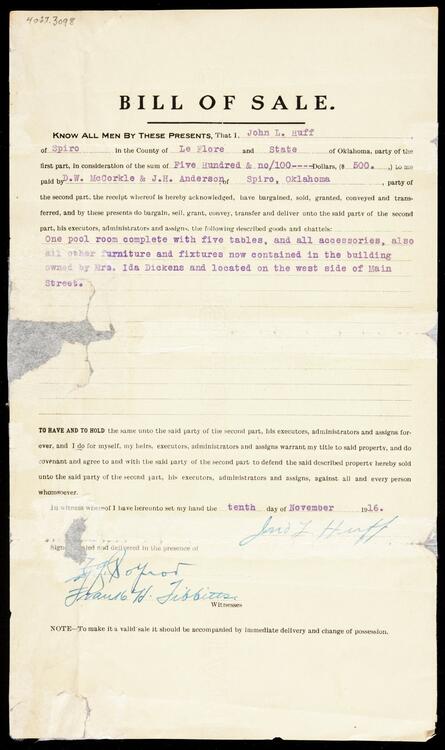Bill of Sale for a pool room and accessories in Spiro, Oklahoma from John L. Huff to D .W. McCorkle and J. H. Anderson