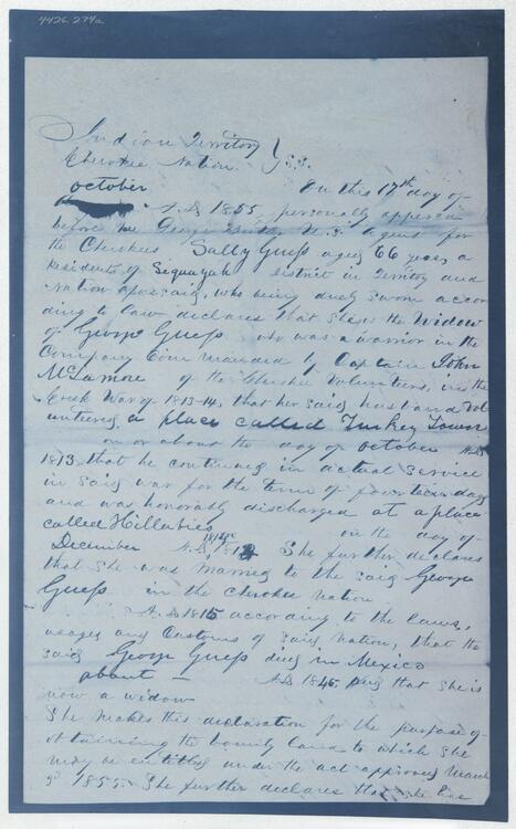 Affidavit of Sally Guess, widow of Sequoyah, given before George Butler, Oonachinsa, and Archibald Campbell