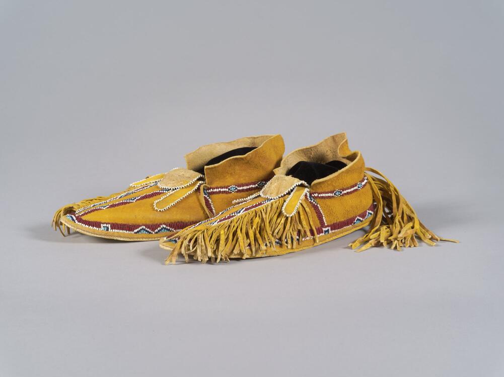 Beaded leather moccasins with fringed toe and yellow pigment