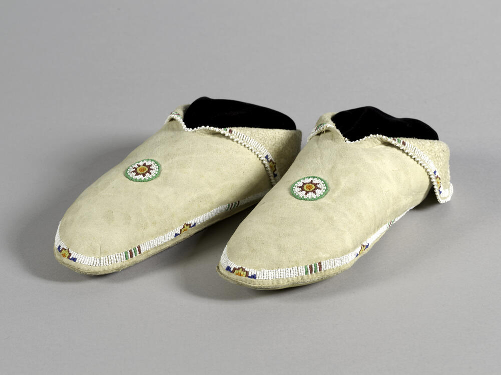 Woman's semi-tanned leather moccasins with beaded cuff and rosette