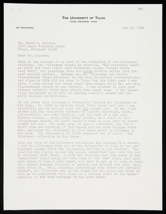 Letter from Alexandre Hogue to David R. Milsten regarding Hogue's design work for the Gilcrease Museum building