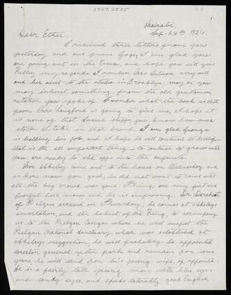 Title: Letter with envelope from Leigh to Ethel regarding upcoming trip to Belgian Congo, painting at Lake Hannington and black-white relations