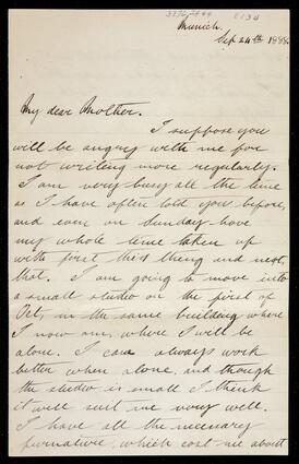 Title: Letter from Leigh to his mother regarding opening a studio, Loefftz will accept him in the Academy, sending seven studies to Baltimore for sale
