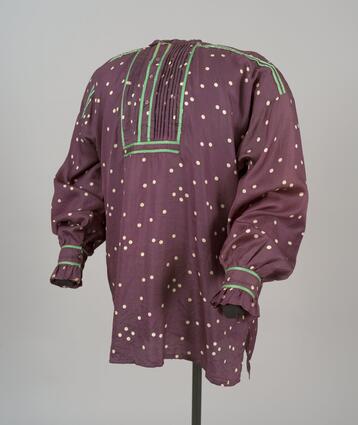Title: Man's purple polka dot silk shirt with green ribbon and pleated bodice
