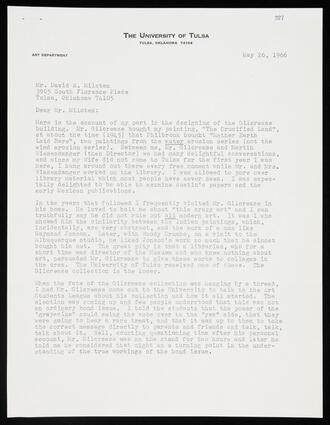 Title: Letter from Alexandre Hogue to David R. Milsten regarding Hogue's design work for the Gilcrease Museum building