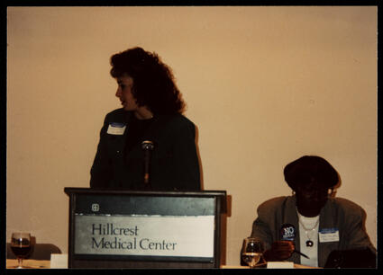 Title: Two unidentified individuals at a meeting for the Business and Professional Women's club at the Hillcrest Medical Center in Tulsa, Oklahoma