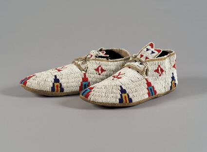 Title: Beaded leather moccasins with white beaded field, tipi designs around perimeter, and red thunderbird design on vamp