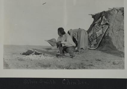 Title: Indian man holding a bellows over a fire near adobe structure with blanket laid on side