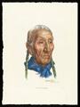 The scene in Noon Meal after Peyote Meeting, a watercolor by Frank Knickerbocker (Otoe-Missouria), derives from the artist’s experiences with the Native American Church (NAC). Following a peyote meeting, men and women sit in a semicircle to dine under a brush-arbor shade. The abundant meal is served by the elderly woman wearing the pale blue dress. The others—with each figure defined by vibrant, painterly strokes—are formally dressed in striped wool blankets and collared shirts, and some wear cowboy hats. A cooking fire on the right is surrounded by pots and utensils used to prepare the meal. Only hours before, the peyote meeting took place in the tipi, now with its poles still erect but uncovered. A drying rack full of meat has been prepared for meeting attendees, so that no one will leave empty-handed. Beyond the gathering, a thin line of deep green spans the horizon and fades into the distance.