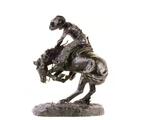 This bronze is marked as cast number 2. Although Greenbaum states that three casts were made of this sculpture before 1919, the ledger only lists cast number 1, which sold on May 31, 1916. The ledger contains neither a listing nor a date of sale for cast number 2. This bronze has two peculiar features. First, the pink color of the investment under the base is unlike other Roman Bronze Works casts found in the Gilcrease collection. Second, the cast number has been applied before casting on the outside of the base, which is inconsistent with cast number application at the foundry between 1916 and 1918. This bronze may have been cast at Roman Bronze Works at a much later date or may not be an original cast.