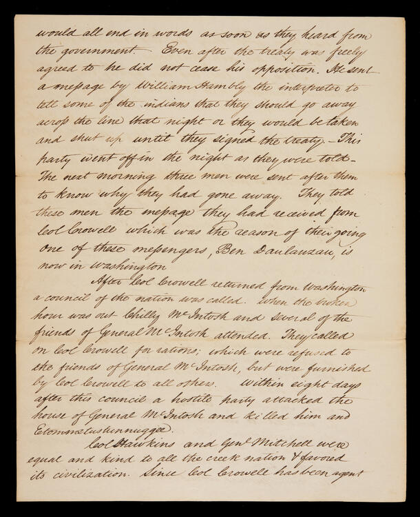 Letter from Chilly McIntosh, Intullifkey McIntosh, Ben Danlausau, and [Jin] Danlausau, Washington, to James Barbour, Secretary of War. Asking for removal of Col. John Crowell, agent to the Creek Nation. Discusses murder of Gerneral McIntosh and Etommetustunnugee by a hostile party following a council of the nation. Also discusses the forceful signing of the Treaty at the Indian Springs. Signers are begging the president to send an agent in fear that General McIntosh will be sacrificed if no action is taken.