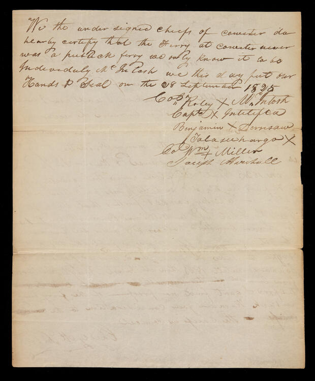 Letter from Chilly McIntosh, Fort Mitchell to chiefs in council at Broken Arrow. Demanding return of flat containing certification by six chiefs of Coweta that the flat was never a public ferry but that of McIntosh.