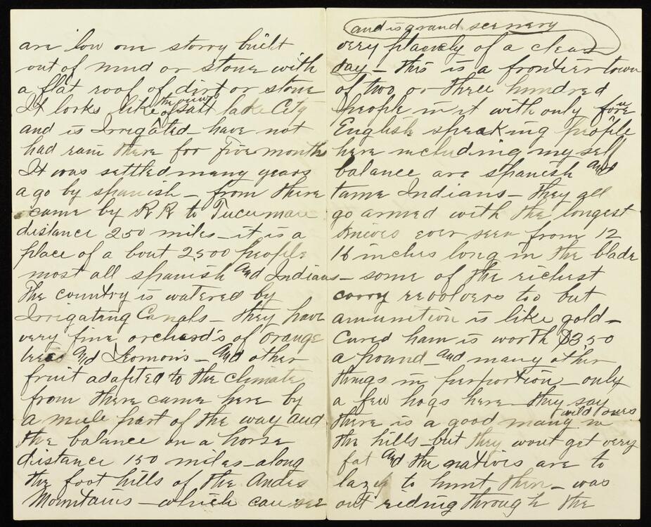 Handwritten letter from Franklin Van Voorhis (inferred) to Mrs. E.T. Van (Voorhis). The contents of the letter concern Van Voorhis’s observations of Argentinian cities and towns.