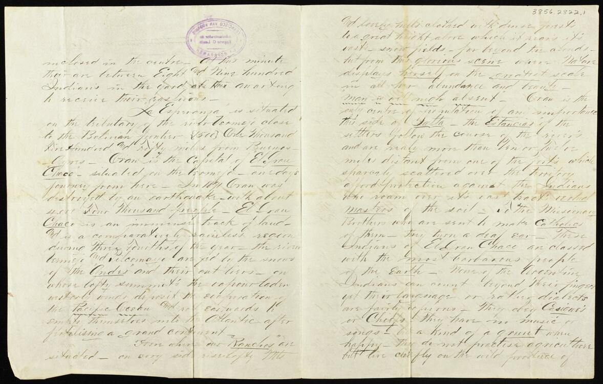 Handwritten letter from Franklin Van Voorhis (inferred) to Mrs. E.T. Van Voorhis. The contents of the letter concern Van Voorhis’s recovery from cholera, observations of Gran Chaco, depictions of indigenous people, and matters of shipping and receiving.