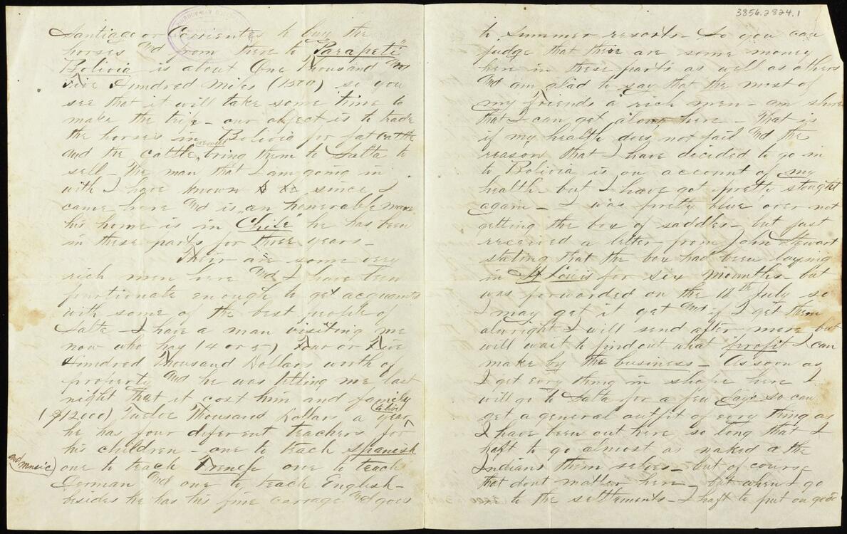 Handwritten letter from Franklin Van Voorhis (inferred) to Mrs. E.T. Van Voorhis. The contents of the letter concern various family matters, Van Voorhis’s Bolivian business venture, wealthy acquaintances, matters of shipping and receiving, appearances, items collected, and money matters.