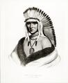 Sepia tone photograph Chief Standing Bear standing in studio setting wearing traditional Ponca clothing. Blanket wrapped around arm with a large necklace. Folder 11