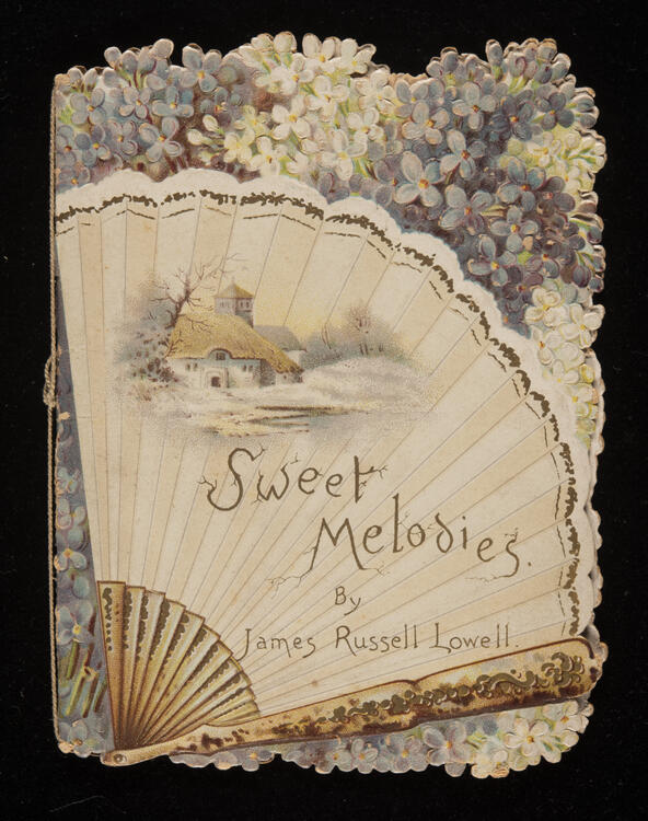 Sweet Melodies by James Russell Lowel booklet. Cover has floral background with fan and an image of building in the snow. Inside: multi-page poem. On back "O. L."