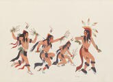 A small model head of a Native American, with a painted face and long brown hair; paint is chipping on chin and nose.
