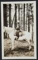 Photograph of bronze of a man on a bucking horse, hand in the air. Handwritten on the back in pencil, "The Bucker + the Buckeroo, $750...". Photograph attached to canvas-like album page with two holes punched on the left side.