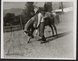 Black and white negative of a man on a horse and holding a gun in front of a log house.