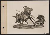 Negative of a photograph of a bronze of a man on a bucking horse resting on a table that is covered with a table cloth taken from a different angle