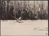 Charles M. Russell on a boat dock with a sinking model ship in the lake nearby.