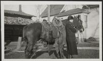 Charles M. Russell, Nancy C. Russell, Josephine Trigg, and an unidentified woman on the porch at Bull Head Lodge. circa 1920.