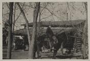 Charles M. Russell with a horse, standing in front of log cabin studio, Great Falls, Montana.