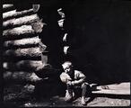 Photograph of Charles M. Russell dressed as an Indian, standing in front of log wall at Bull Head Lodge, Montana. Circa 1915.