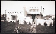 Nancy C. Russell and two female friends in garden of California home.