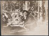 Photograph of two people, a man and young woman, standing on the porch of a house. Handwritten on the back, "Lou and Lady Lou at Riverside [illegible] Lake". May be a cyanotype.