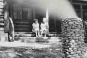 Photograph of the front view of Trail's End with people standing on second-story balcony.